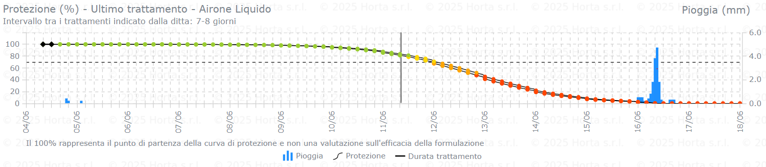 I prodotti indicati per mantenere la protezione sono Poltiglia Bordolese o Ossicloruro di Rame IN ABBINAMENTO con un idrossido/solfato tribasico (alla dose di 300-350 gr. di principio attivo per ettaro) (ES: 300g Rame metallo ettaro Tot = 150g da ossicloruro + 150g da idrossido). L’aggiunta dell’idrossido/solfato tribasico ci garantisce una miglior prontezza di azione del rame su foglia, garantendo protezione immediata anche nelle situazioni di corte bagnature notturne, dove i sali più persistenti farebbero fatica a dissociarsi velocemente.