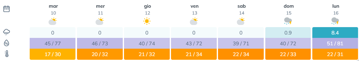 Tempo stabile per tutta la settimana, caratterizzata da un aumento delle temperature medie con massime superiori ai 30°C. Possibili rovesci partiranno da domenica pomeriggio e potrebbero protrarsi fino a martedì prossimo. Lo sviluppo di queste perturbazioni andrà monitorato durante il fine settimana.