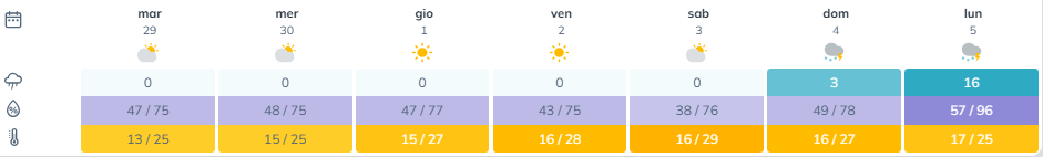 La settimana è all’insegna del bel tempo, con temperature in considerevole aumento, al di sopra della media stagionale. Da monitorare eventuali svolte verso fine settimana o locali situazioni di instabilità per inizio di settimana prossima. Da domenica pomeriggio avremo le prime piogge che proseguiranno fino a lunedi compreso. Le condizioni stanno favorendo una rapida crescita vegetativa.